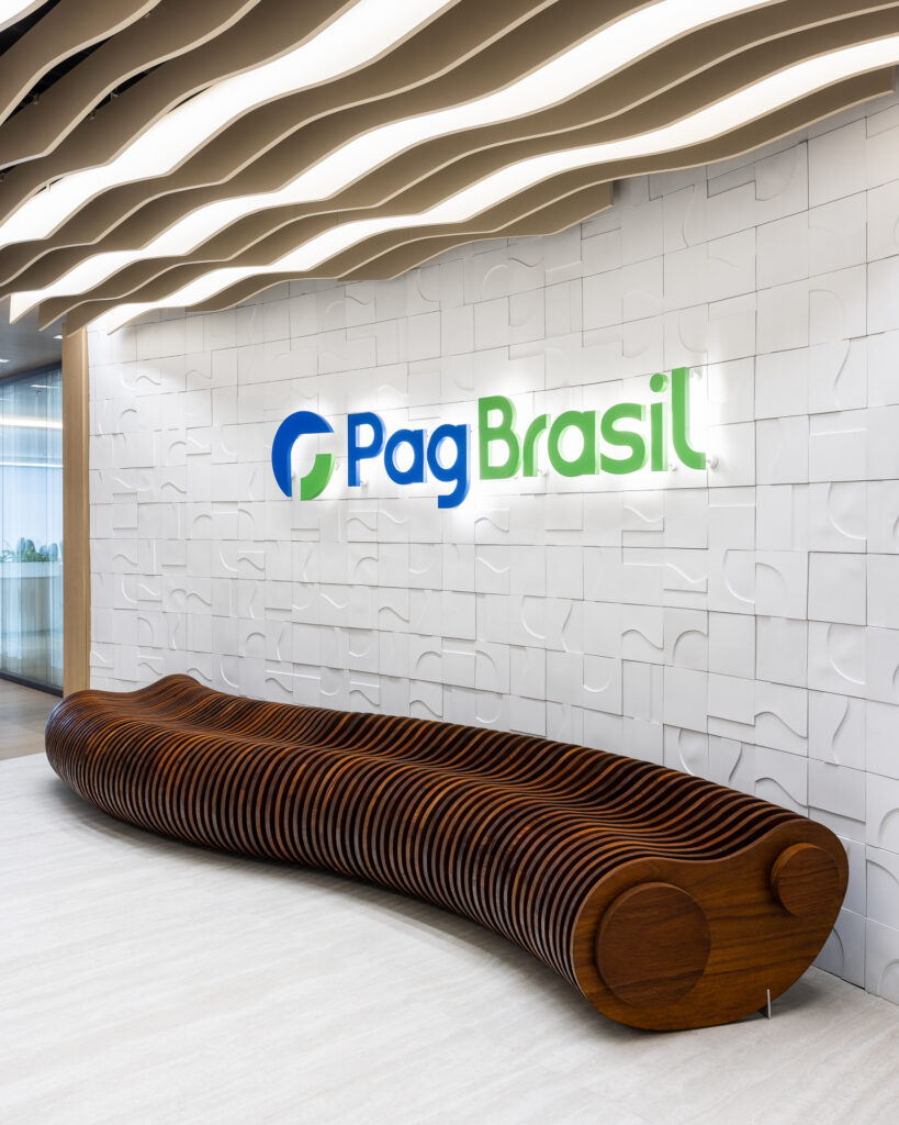 Na PagBrasil, essa textura transformou a recepção em um painel de boas-vindas vivo, que convida o olhar e o toque.